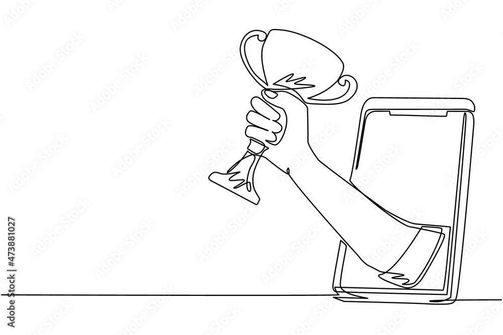 Continuous One Line Drawing Trophy In Hand Coming Out From Mobile Screen Smartphone With App Soccer Football Mobile Sports Stream Championship To Play Single Line Draw Design Vector Illustration Stock Vector